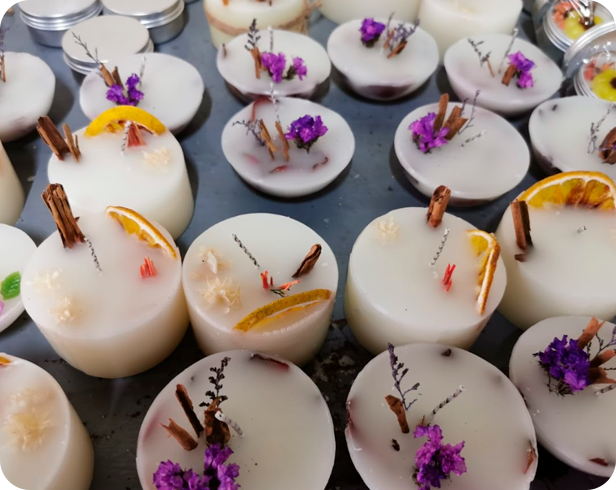 Frascos y pomaderas rellenas de cera de soja, flores y varias figuras con terminados texturizados y pabilos de madera, con cuarzos y hierbas